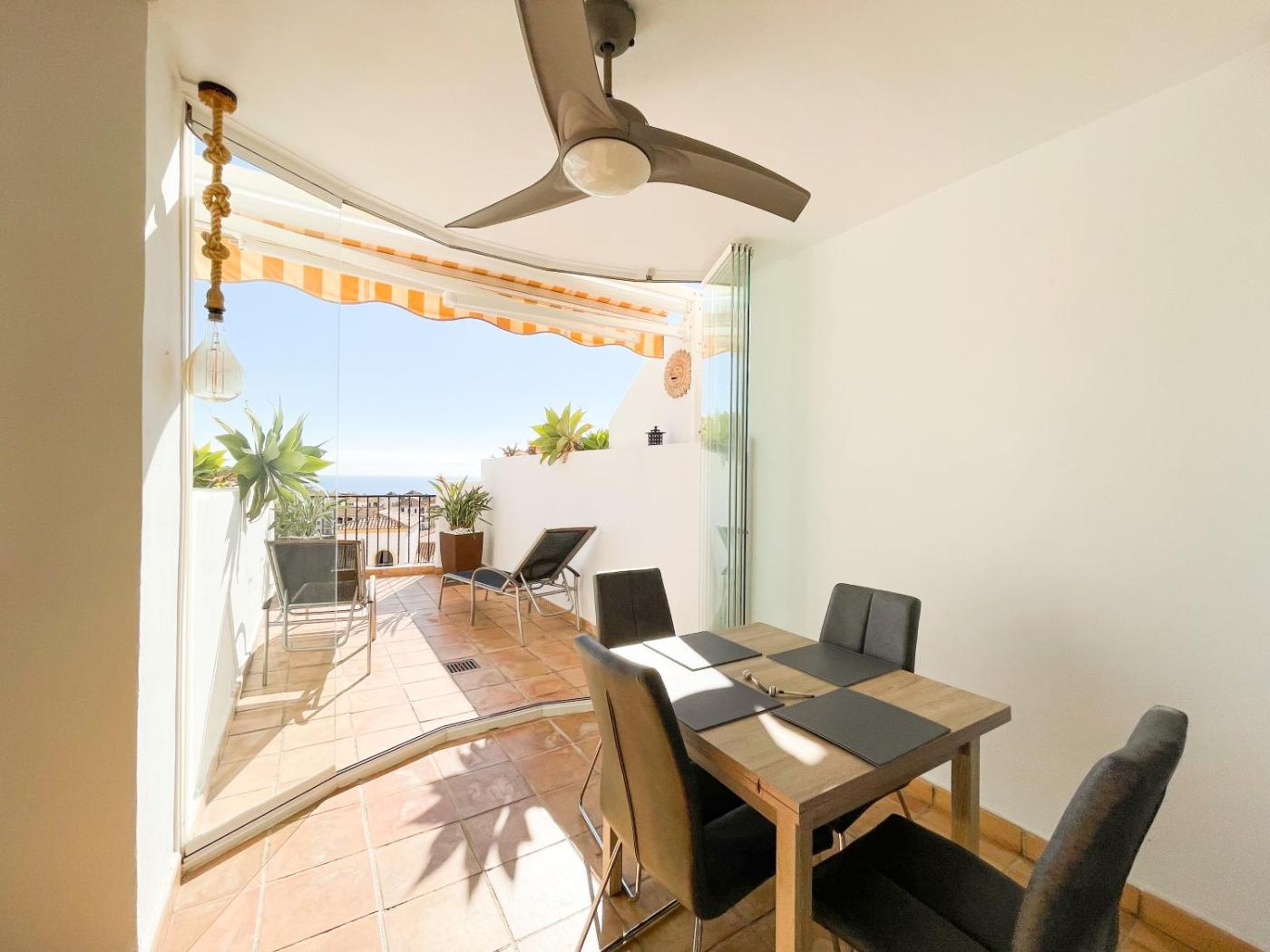 The spacious apartment with a terrace and sea views features 1 bedroom, a living room, a flat-screen TV, an equipped kitchen with an oven, and 1 bathroom with a bath.