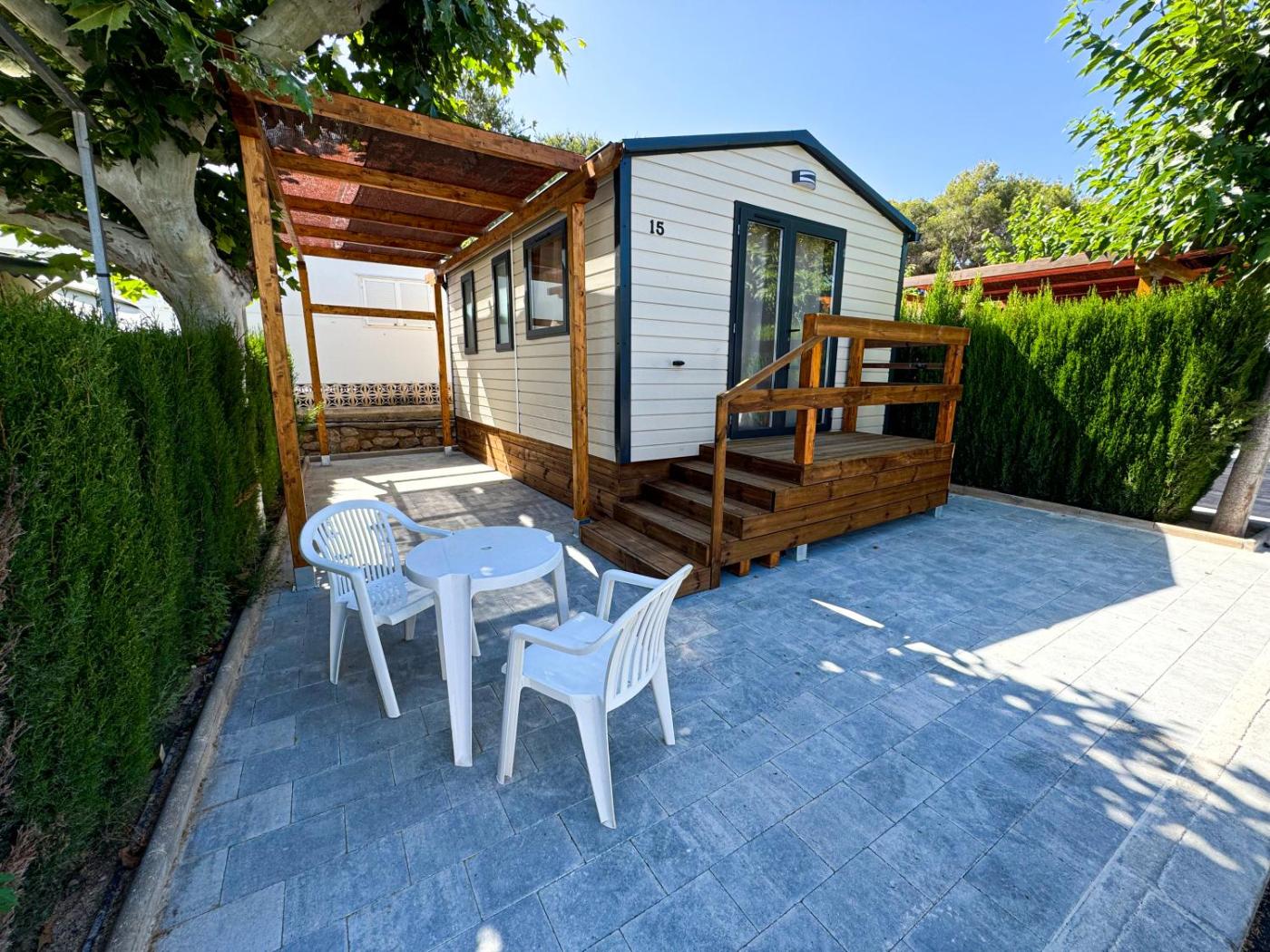 Mobile Home. This air-conditioned mobile home features 1 living room, 2 separate bedrooms and 1 bathroom with a shower. In the fully equipped kitchenette, guests will find a refrigerator, kitchenware, a microwave and a toaster. Boasting a terrace, this mobile home also features a tea and coffee maker, a dining area and a flat-screen TV with cable channels. The unit has 3 beds. ;