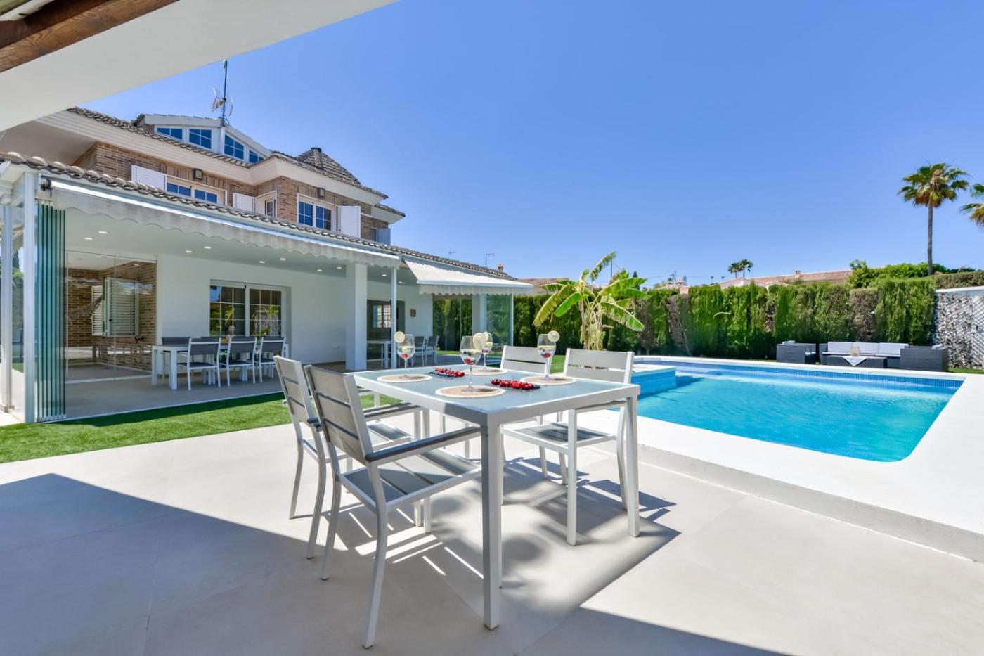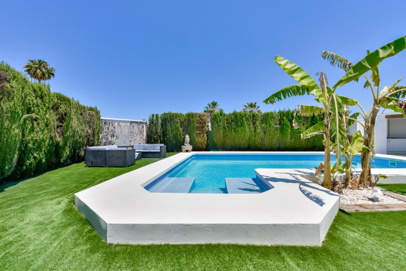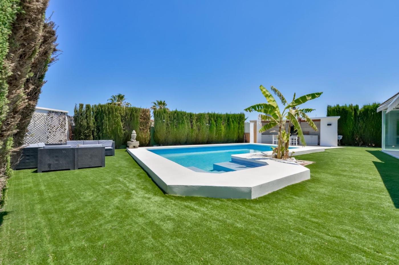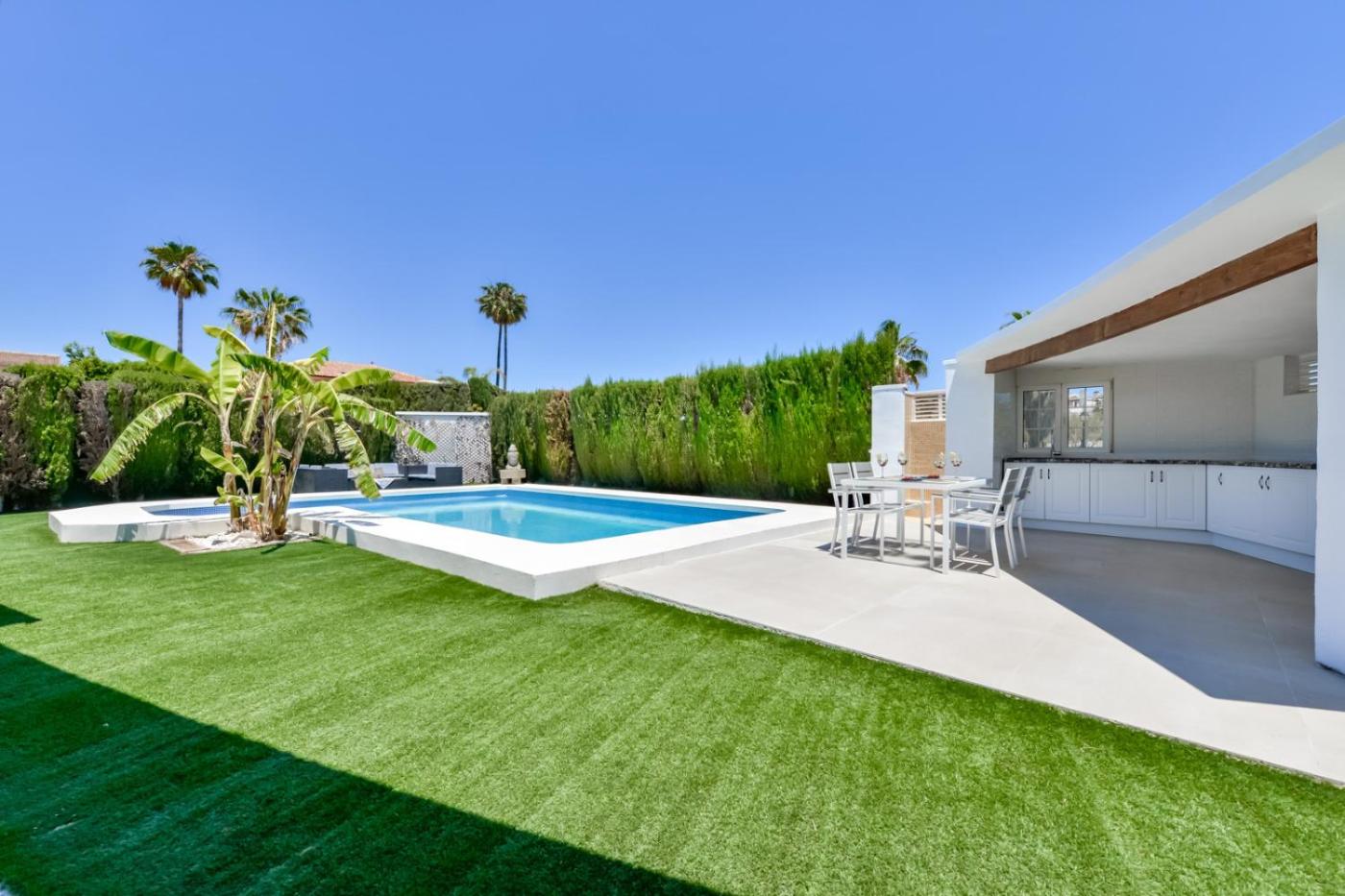 Villa. This villa provides a private pool. Featuring 5 bedrooms and 3 bathrooms with a bath, this spacious villa offers a well-fitted kitchen and a terrace. The well-fitted kitchen features a refrigerator, a dishwasher, kitchenware and an oven. The air-conditioned villa offers a TV, a washing machine, a tea and coffee maker, a barbecue as well as garden views. The unit has 7 beds.